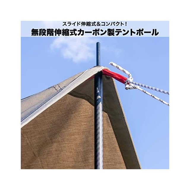 【スライド伸縮式&コンパクト! 無段階伸縮式カーボン製テントポール】<br> カーボン製のスライド伸縮式テントポール!高さは無段階で43~180cmに簡単に調節ができます。安心の最大直径23mm。収納時もコンパクト!<br> <br> 【長さ約43~180cmに対応 細かな高さ調節ができる】<br> 当ポールはスライド式の6継無段階調節式を採用。高さは43~180cmの間で設定できます。また収納時もコンパクトに収まるので持ち運びラクラク!<br> <br> 【最大直径23mmのカーボン製 軽量・コンパクトで持ち運び◎】<br> カーボン製の為、軽量ながら強度もあります。コンパクト収納でき、持ち運びもしやすいです。ソロキャンプやテント泊登山にもオススメです。<br>