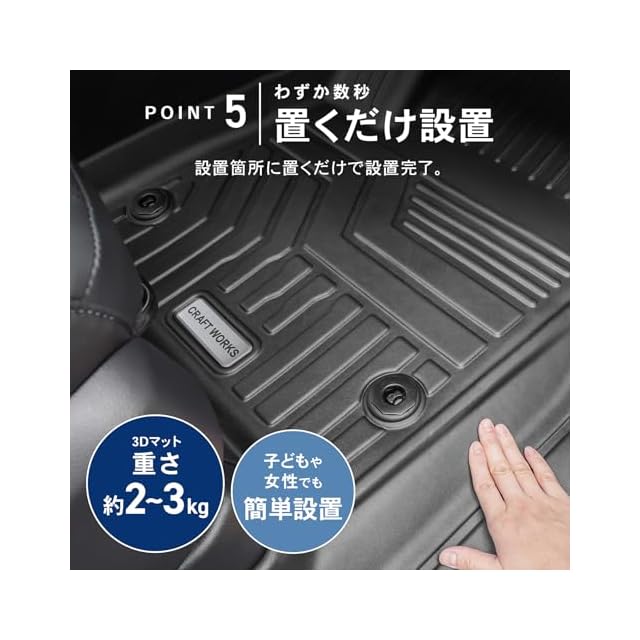・純正カーペットの悩み、もうさようなら! カーペットタイプのフロアマットは、ゴミが詰まりやすく、取れづらい、、さらに水洗いしても茶色い水が出続けるというお悩みがあります。掃除に時間を取られる毎日…。そんなカーペットの手間を解消するのが、CRAFT WORKSのTPE製フロアマットです。丸洗い可能で汚れを簡単に落とし、清潔を保ちます。 ・アウトドアやスポーツ後もへっちゃら! キャンプやBBQ、釣り、お子様のサッカーや野球などで汚れた車内も、TPE素材のフロアマットなら簡単にお手入れが可能。水や泥がついても、簡単に拭き取れます。ドライブやカーライフも家族で楽しめます。 ・簡単設置で手間いらず!女性にも優しい設計 置くだけ設置なので、工具や手間なしで女性でも簡単に設置可能。商品が届いてすぐに車内をすぐに快適で清潔な空間に変えられます。 ・3D立体構造でゴミをしっかりキャッチ 独自の3D立体構造と2〜3cmの縁高設計で、車内に落ちたゴミや汚れをしっかりキャッチします。水や泥も簡単に拭き取れるため、アウトドアやレジャー後でも清潔を保て、次のお出かけ準備も楽々。・ ・TPE素材でタフに守る 厳選されたTPE素材は、難燃性にも優れ耐久性が高いため、長期間の使用でも形状が崩れることなく、しっかりと車内を守ります。ゴミが詰まることなく、常に快適な状態を保ちます。 ・車種専用設計でピッタリフィット 自動車整備士監修のもと、国内でのサイズ計測を行い、車種専用設計でピッタリフィット。信頼の設計で、長期間使用しても安定した性能を発揮します。