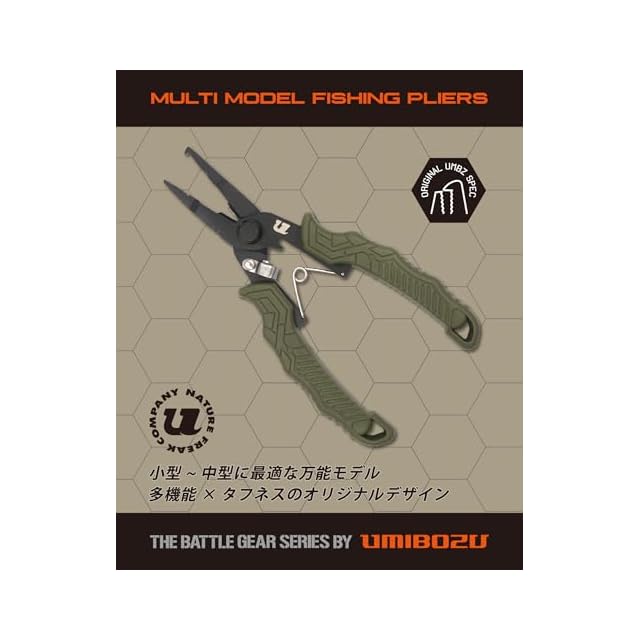 ウミボウズからマルチモデルのプライヤー登場!小型~中型に対応し、幅広い釣りに対応可能なマルチモデル。#1~#5のスプリットリングに対応。針外し、リングオープナー、ラインカッター、アイチューナーなどプライヤーとしての当然の機能を搭載。強度×防錆の高強度ステンレスにフッ素コーティング仕様でタフネス。型をいちからデザインしたウミボウズオリジナルグリップは小さくてもグリップ力抜群。