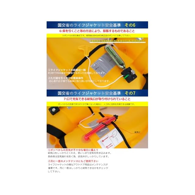 このフローティングベスト型のライフジャケットに搭載されているボンベは国際安全基準CNASの試験をクリアした製品です。ライフジャケットの保管は湿気の少ない風通しの良い場所で行って下さい。フローティングベストの上に物を置いて保管するなどはおやめください。またライフジャケットを着用しない場面でライフジャケットの上に座ったりすると製品が破損する原因となりますので、ご注意下さい。