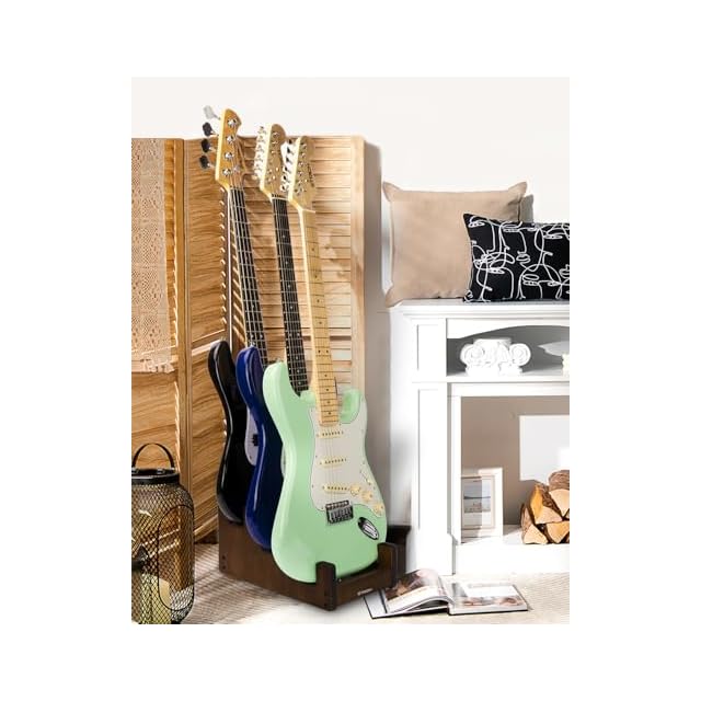 【安全な間隔設計】GS-Lシリーズの木製ギタースタンドでは、3つのギターを適切な位置に置くことができ、衝突を避けることができます。壁に近づけて置くこともでき、ハンドル付きのエレキギターにも適しています。