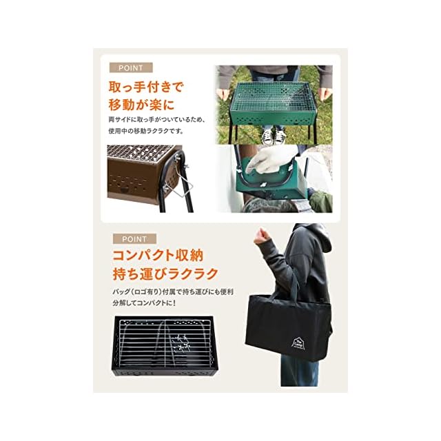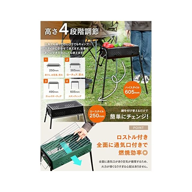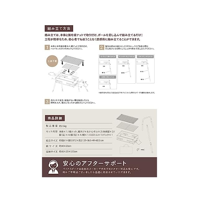 ✅【製品仕様 / セット内容 / 】【仕様】本体サイズ:(約)幅610x奥行372x高さ605mm(組み立て時)、(約)幅400x奥行230x高さ125mm(収納時)、網サイズ:(約)400x230mm、本体重量:約2.3kg、材質:スチール【セット内容】本体×1、蝶ネジx6、蝶ナットx6、ハンドルx2、脚(本体側)x2、脚(長)x4、脚(短)x4、網x1、ロストルx1、バッグx1