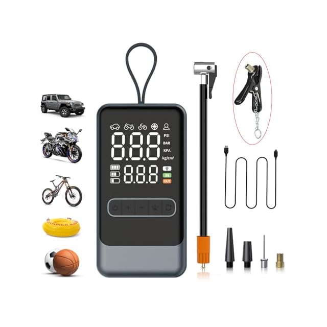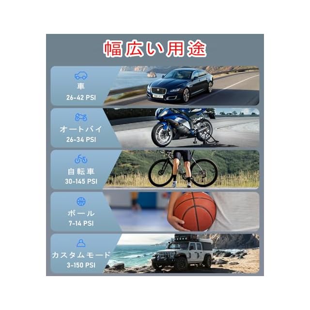 【最大150PSI高速充填&自動停止】この電動空気入れは毎分25,000回転の強力なモーターを採用しており、他の同タイプの空気入れに比べて30%高速である。最大150PSIの高圧力を実現することで、バイクや自転車のタイヤ、さらにはバスケットボールなどのスポーツ用品にも対応でき、非常に多用途の空気入れです。本空気入れ 電動は自動停止機能を搭載しており、設定した圧力に達すると自動で停止します。これにより過充填を防止し、タイヤやアイテムの劣化を避けることができます。
