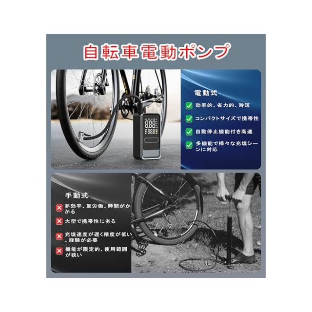 【一台多役&コンパクトで操作しやすい】この自転車 空気入れは英/仏/米バルブ、ボールバルブに全てサポート。車、バイク、トラック、自転車、ボールなど、どんなタイヤにも簡単に対応できます。ワンボタン操作で、数分でタイヤの空気入れが可能。初心者でもすぐに始められる。本空気入れ 自転車はコードレスで軽い(13.4*7*5cm 390g)、家族での旅行や長距離ドライブでも、いつでも簡単にタイヤを充填することができ、安全なドライブを実現します。※注:初めて使用する場合は、まず本体を完全に充電してください。
