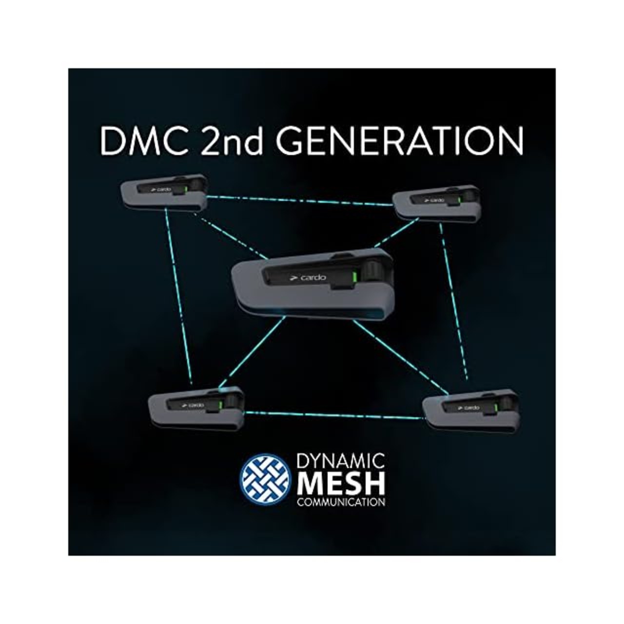 次世代メッシュ通信に対応 : ダイナミックメッシュコミュニケーション(DMC)とは、1対1のBluetooth接続と異なり、複数のインカム同士が1つのグループ内で網目のように繋がる通信方式です。インカム同士のペアリングや走行中の通信にまつわる、従来のBluetoothインカムの悩みを解決してくれるカルドの先端技術です。