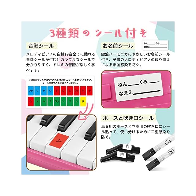 【3種類のシール付き】音階シール、お名前シール、ホースと吹き口シール付き。鍵盤ハーモニカの学習が楽になるだけでなく、メロディピアノやホース、吹き口の取り違えによる細菌感染も予防する。