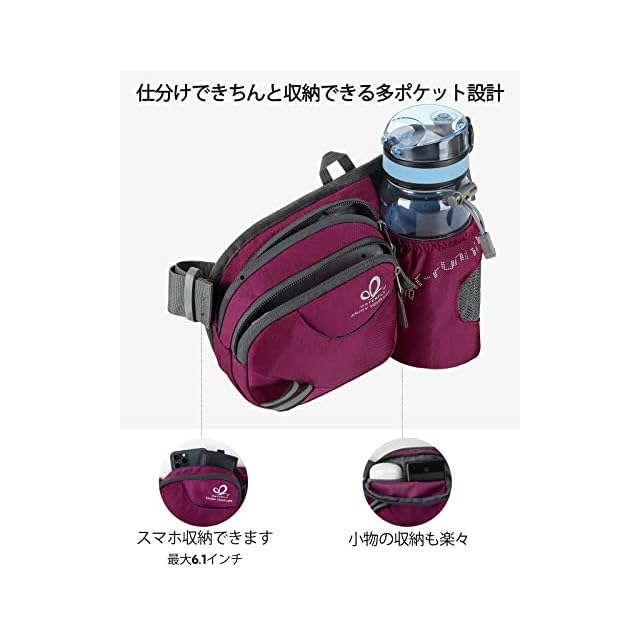 【便利で収納力は抜群】小物収納ポケットが3つ付きのウェストバッグで、ケータイ(iPhone 12Proなど)、鍵、小銭、ハンカチ、ペットボトル、パスポート、バンドエイド、ティッシュ、財布などを仕分け・収納することに便利です。(水筒がついていません)
