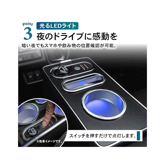 POINT.3 「夜のドライブに感動を」 スイッチを押すだけで点灯します。 荷物の位置確認、収納ボックスから荷物の取り出しも簡単です。 ・POINT.4 「車内の電源を完備」 上の面にはタイプA、タイプC差し込み口を各1つずつ配備。 シガーソケット差し込み口も配備。 ・POINT.5 「耐久性抜群」 丈夫で長持ちするPVCレザー。 シンプルなデザインを兼ね備えています。