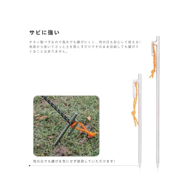 【サビに強い】 : チタン製ペグなので海水でも錆びにくく、雨の日も安心して使える! 地面から抜いてさっと土を落とすだけでそのまま収納しても錆びてくることはありません。