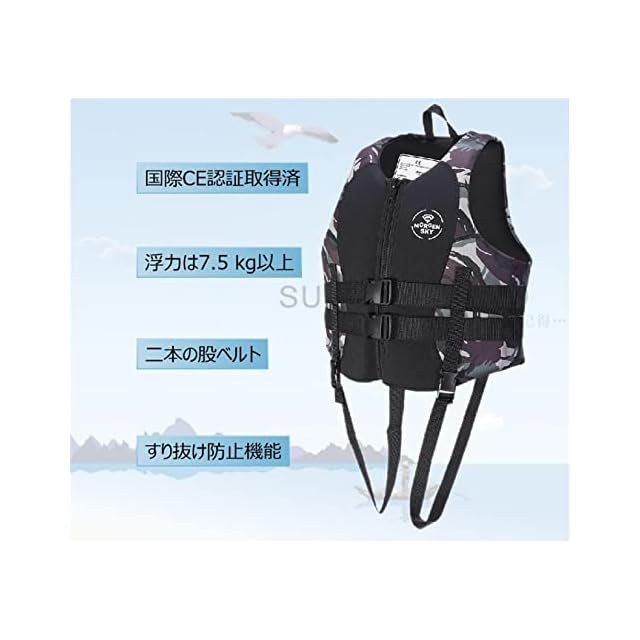 MORGEN SKYの高品質かつ高機能性のライフジャケットはYKKファスナーを採用し、簡単に外れる心配はありません。 生地は ウェットスーツ専用のネオプレン素材で施されており、耐久性は高いし、撥水性、防汚性、速乾性にも優れております。 浮力は 7.5kg以上に達し、緊急時にしっかりと命を守ってくれます。 【用途について】スクーバダイビング、スキンダイビング、スノーケリング、サーフィン、ウィンドサーフィン、ヨット、水上 オートバイなどのウォータースポーツ、水中土木、レスキュー・サルベージ、海上建築物上での作業などの職業的な水中・水上 活動に着用できます。 【注意事項】 1、海から上がったら、なるべく早めに洗うのはおすすめです。 2、熱いお湯はNGです。必ず水かぬるま湯で洗ってください。 3、直射日光を避け、細いハンガーを使用しないてください。 4、しっかりと乾燥したら、なるべく早めにもとへ戻ってください。