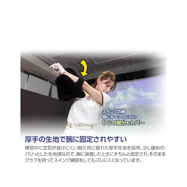 空気で膨らませた後に腕に装着して挟むだけで、スイングに大事な腕の三角形を自然と矯正したままスイングできます。