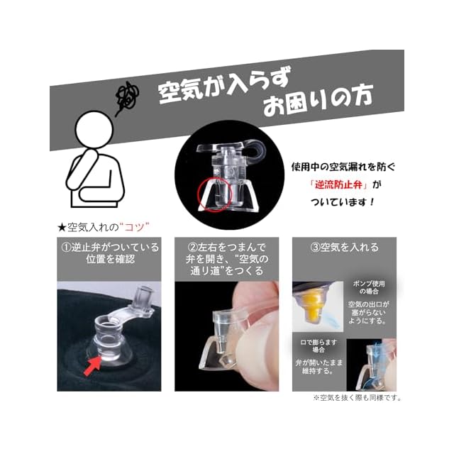 空気を入れるコツ:本品ろ広げて「空気栓」の根本を指でつまみながら空気を吹き込んでください
