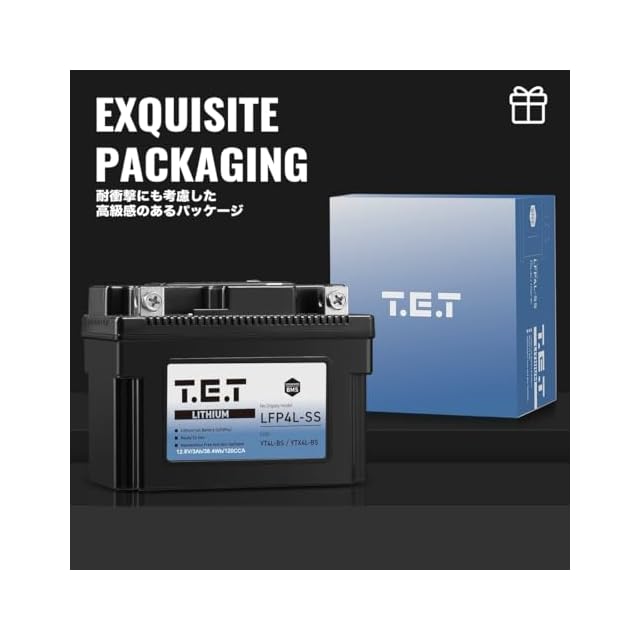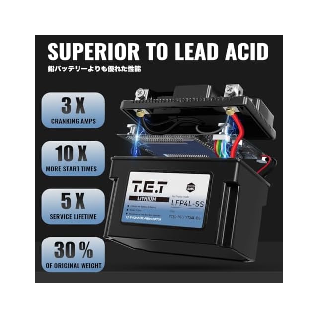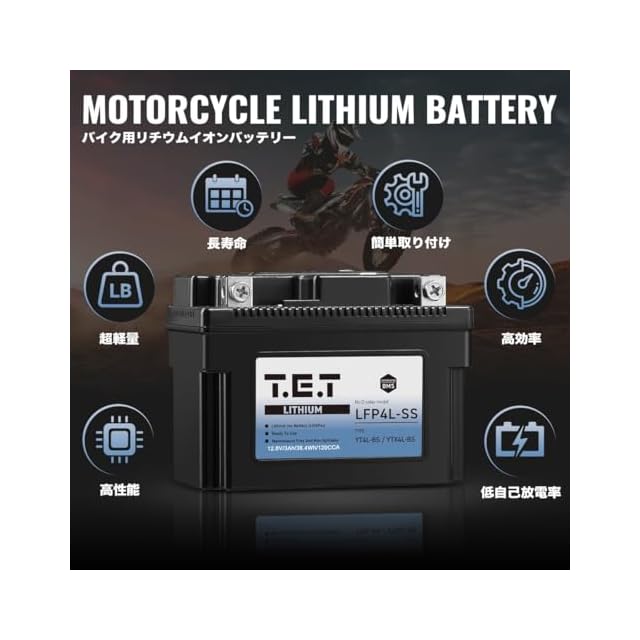 【超軽量・高性能】<BR> 従来の鉛バッテリーに比べて約1/3の軽さで車両の軽量化に貢献し、走行性能や燃費の向上を実現。さらに、約1.5倍の強力な始動性能と優れた低温始動性能で、大型車両や寒冷地でも安心です。<BR> <BR> 【長寿命・メンテナンス性】<BR> 鉛バッテリーの1.5倍以上のサイクル寿命で経済的。低い自己放電率により長期間保管が可能で、こまめな充電が不要なためメンテナンスも簡単です。<BR> <BR> 【安全性・利便性】<BR> 鉛バッテリーに比べ液漏れの心配がない設計で横倒し使用も可能。BMS機能やLiFePO4電池の採用により、衝撃に強く高い安全性と耐久性を実現しています。<BR> <BR> <BR> ■即使用可能 電圧測定ディスプレイ付き<BR> ■T.E.T エントリーモデル CCA120<BR> <BR> T.E.Tリチウムイオンバッテリーで、走りに革新を。<BR> 高品質・高出力。しかも手頃な価格で、あなたのバイクライフを進化させる。<BR> バイクの性能を引き出す、次世代リチウムイオンバッテリー。<BR> <BR> ■電圧:12V 3Ah 120CCA<BR> ■サイズ (約):横幅113mm / 奥行70mm / 高さ85mm<BR> ■重量 (約):0.6kg<BR> ■適合サイズ:YT4L-BS / YTX4L-BS / YTZ5V 専用<BR> <BR> ■メーカー期間:長期2年間(商品日より730日)<BR> ■バイク用 鉛充電器で充電可能!推奨アンペア0.8〜1.5A<BR> <BR> ■特徴<BR> 高品質なセル技術を採用し、電池容量・電圧ともに高性能を実現。<BR> さらに、さまざまな車種に対応する豊富なサイズラインナップをご用意。<BR> <BR> 「価格」と「品質」を両立し、コストパフォーマンスは業界トップクラス。<BR> バイクライフの新しいスタンダードとして、安心してお使いいただける製品です。<BR> <BR> 長寿命・軽量:従来の鉛バッテリーと比べて圧倒的に軽量、長寿命経済的かつパワフル。<BR> <BR> ぜひ一度、T.E.Tリチウムイオンバッテリーをお試しください!<BR>