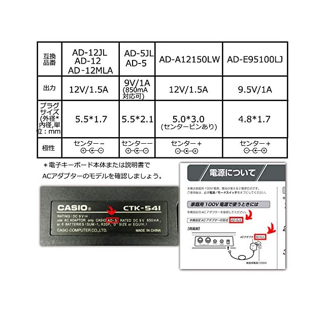 AD-5JL:出力:9V 1A プラグ:5.5 * 2.1mm 極性:センター - 対応機種:PA-1B、CTK-411、CTK-560L、CTK-650、CTK-625、LK-20、LK-22、LK-35、LK-36など