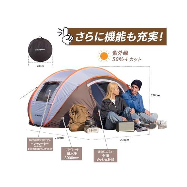 商品名:EchoSmile ポップアップテント 4人用 1秒簡単組立 ワンタッチ 防水耐水圧3000mm 防UV+防蚊ネット付き キャンプ用 家族用テント 軽量設計 (2/4/6/8人用選択可)