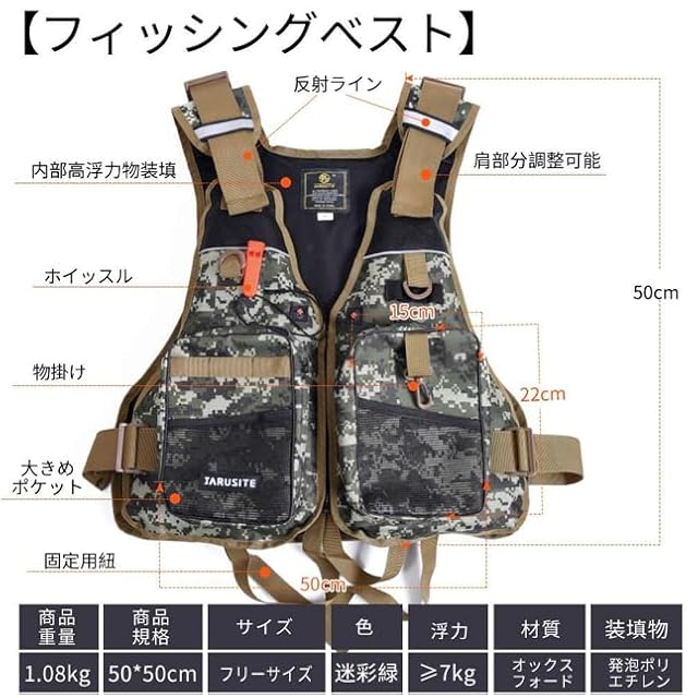 *材質:ポリエステル+ EPEフォーム EPEフォーム素材で、摩耗や損傷の激しい場合にも破損しにくいです。 ※本製品のサイズ:本製品は50x50㎝となりますが、肩部分や腰部分は調整可能となっておりますので、大人なら普通に入れます。浮力は7㎏以上となりまして、体重が95㎏の方まで対応可能。重量は900gです。 こちらは多機能且つ通気性、速乾性がなベストで、サイズの大きさを調節することができますので、ほとんどの男性の体型に合えます。使い勝手を考慮したポケット配置に加え、部品及び道具などを収納することができ、非常に使いやすいです。長持ち、通気性の優れた素材で作られ、そして涼しい生地のメッシュ仕様で、快適さを高めました。磯釣り、ルアーフィッシング、海釣り(ほとんどのお釣り)に適です。