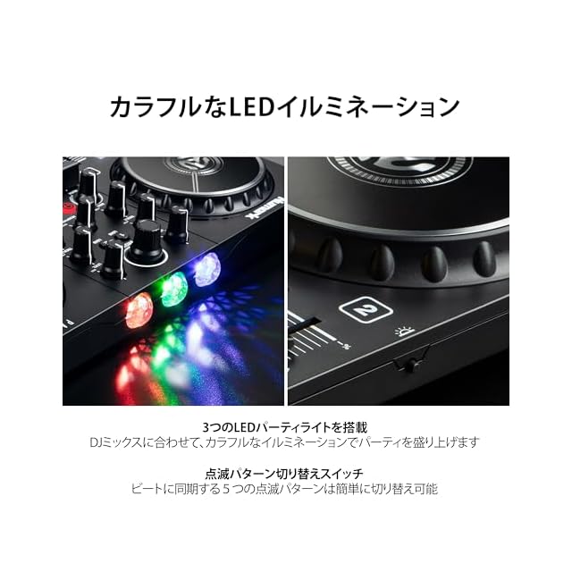 【カラフルなイルミネーションと豊富なDJ機能】DJミックスに合わせて点滅するLEDパーティライト、SYNCボタン/再生・停止ボタン/CUEボタン、タッチセンシティブ・ジョグホイール搭載