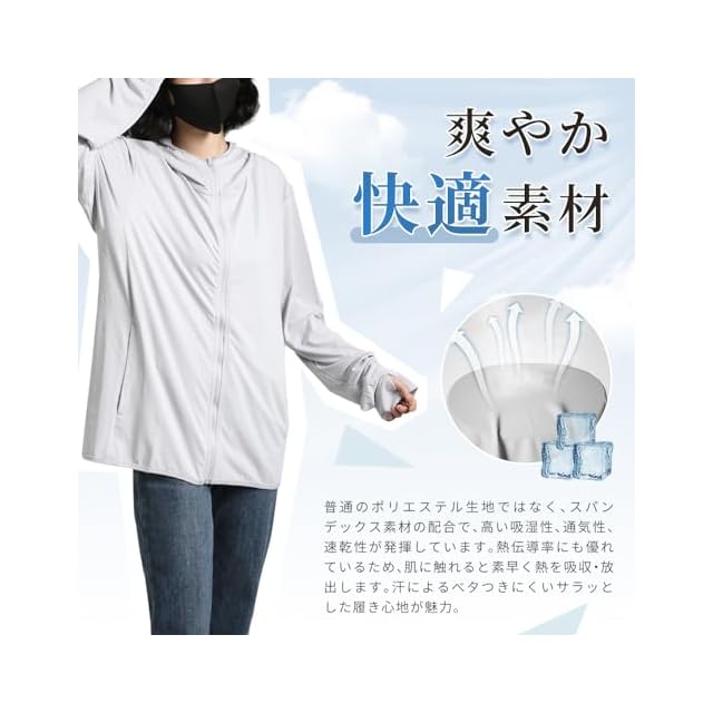 【360°日焼け止めパーカー】フードや指穴付きで頭から手の甲まで紫外線をカット!軽くて薄い材質なのに、透けないです。物理的上も、紫外線カット機能をちゃんと発揮します。