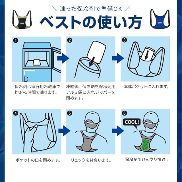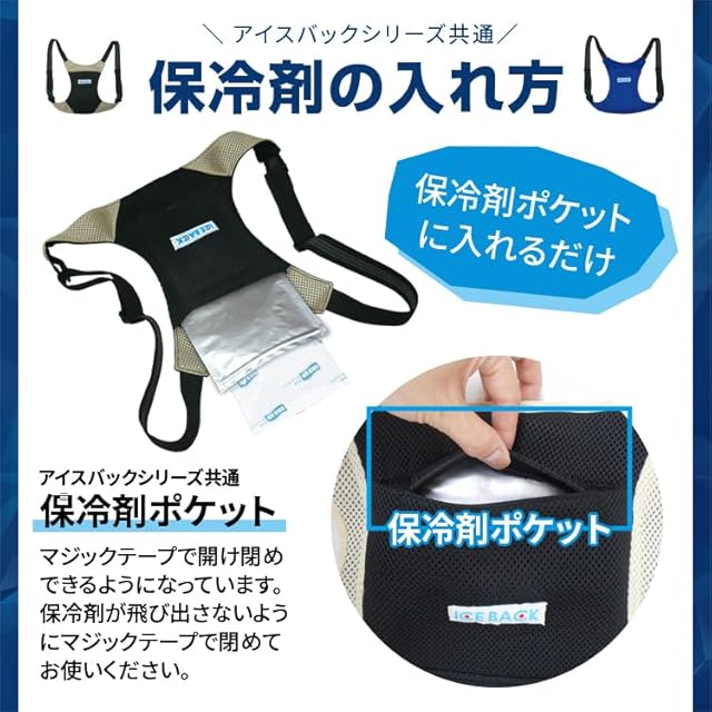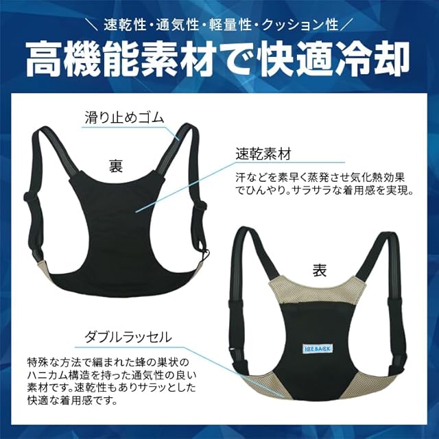 ●背中に速乾素材を使用しさらさら快適な着け心地です。●背中のポケットに専用保冷剤が縦に入り、効率よく冷やします。●蜂の巣状のハニカム構造をもった通気性の良い生地ダブルラッセルを使用。速乾性もあり快適な着用感を実現しました。●カイロを入れれば冬でも大活躍!