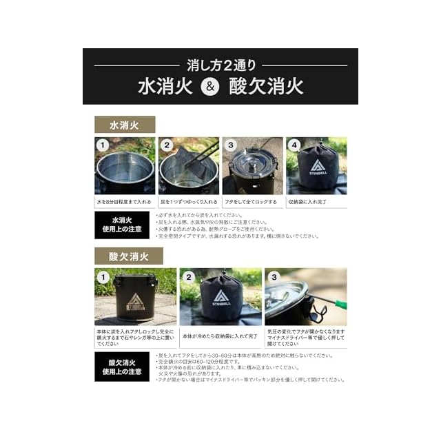 【完全密閉で完全鎮火】STINBELLの火消しつぼは消火方法が水消火と酸欠消火の2通り可能。水を8分目まで入れた炭消し壺に炭を入れて消す水消火と火消しツボに直接、炭を入れ蓋をし消火する酸欠消火ができます。酸欠消火は鎮火に時間がかかりますが、後片付けが簡単です。残った炭は着火しやすく、次回の火おこしに再利用。時間がない方には水消火がおすすめです!