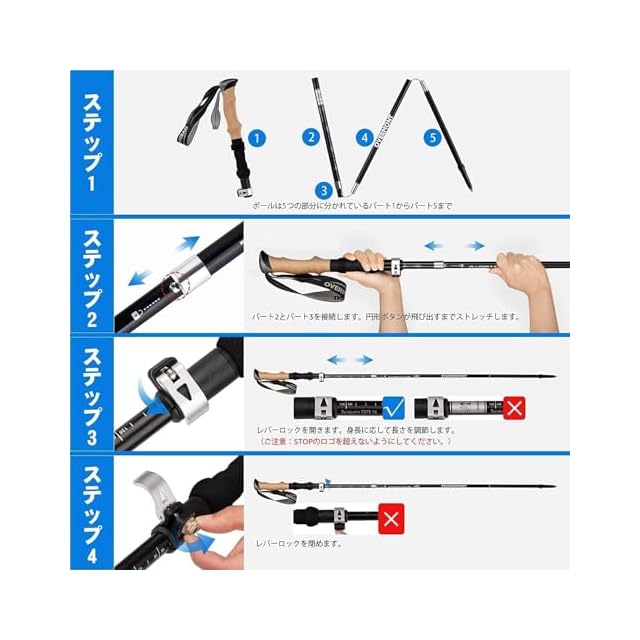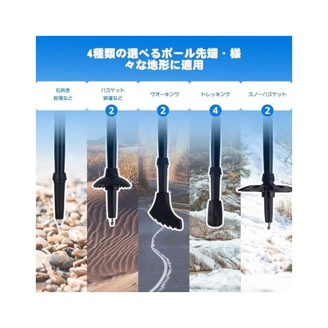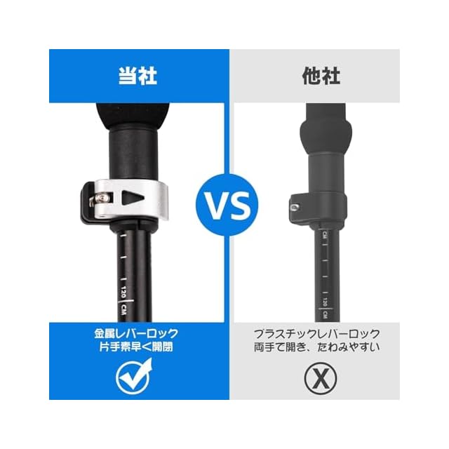 【人間工学グリップ】人間工学に基づき手の形に合うよう設計されています。グリップが付き、握り心地が良くて、長い時間で使用しても手が疲れないです。調整可能なストラップがあり、ストックの脱落を防止できます。ゴム製足なので滑らない、使用者の安全を確保できます。
