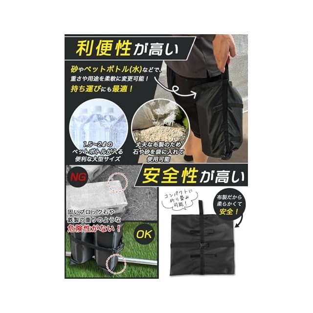 【たっぷり入る4Lの容量】バッグ1個あたり約4Lの内容物が入れられ、砂であれば約10kg程度の充填可能です。近くにある砂や小石、泥などをすばやく詰めて重しとして利用できます。※水を直接バッグに注ぐことはできません。※砂や重りは付属しておりませんので別途ご用意ください。