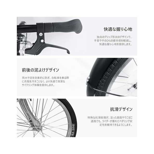 折りたたみデザイン:この20インチの折りたたみ自転車は、瞬時に折りたたむことができ、非常にコンパクトになります。そのため、持ち運びや収納が非常に便利です。車や公共交通機関を利用しての移動時にも軽々と携帯でき、雨の日にも家に収納できます。