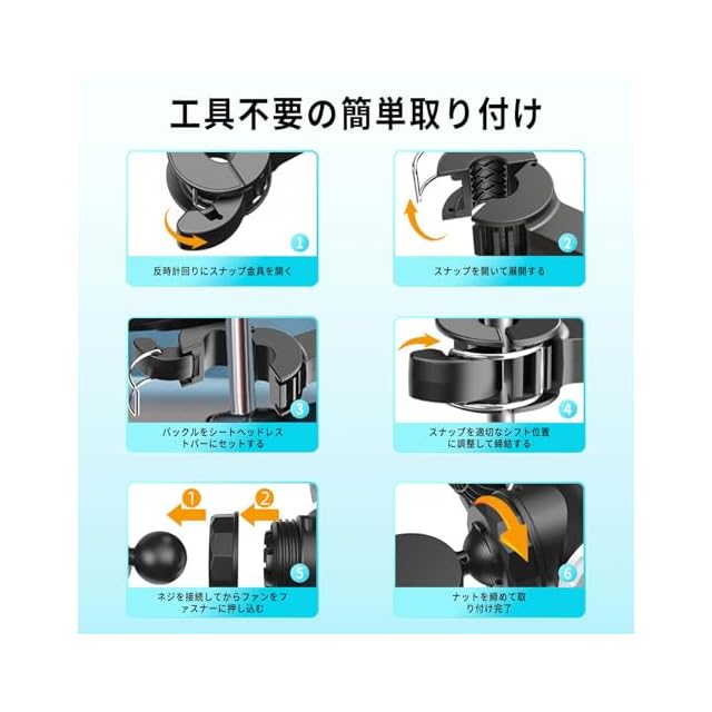 【工具不要の簡単取り付け】車内扇風機 usbは操作が簡単、ヘッドレストポールにクリップで固定するだけ!使用中に車から落ちる心配がなく、安全に使用できます。専用柔らかいパッド付きで車を傷つけず、5分で完了する手間いらず設計。1.8mの長さの電源コードが付属しているため、車の後部座席周辺にも手軽に設置できます。