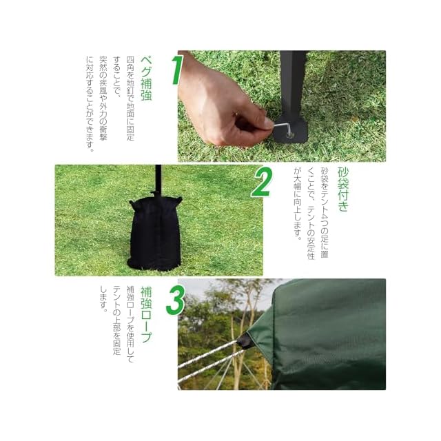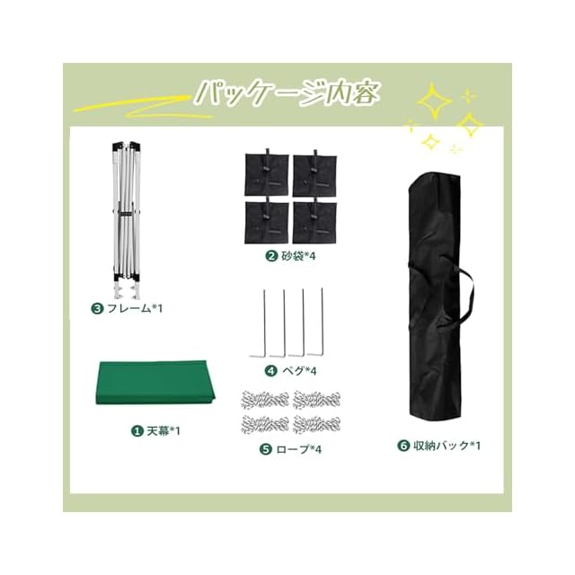 ✅【3段階調整】このワンタッチタープは3段階に高さを調整することができるので日差しが強い日はロースタイルにするなどアレンジが可能です。ペグ(4)とロープ(4)と砂袋(4)を付属しており、フレームを地面に固定できて、多少の風でも安心して使用できます。(*風が強い時は設営しないでください)