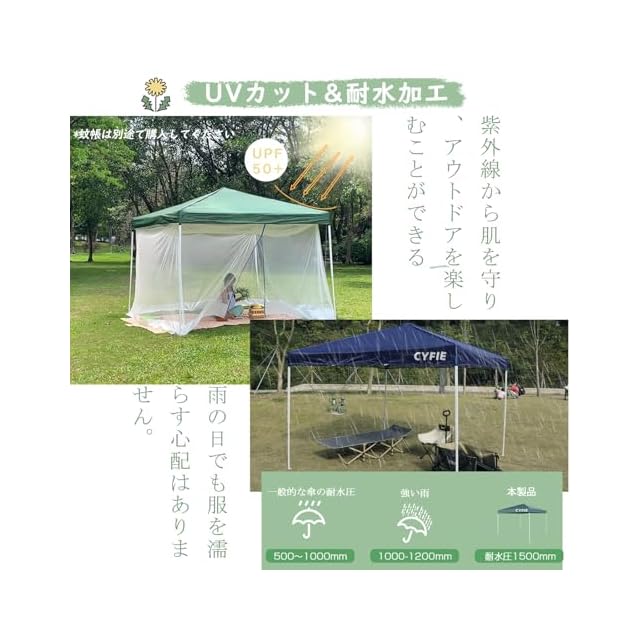 ✅【UVカット&耐水加工】タープテントの裏地にはシルバーコーティング加工が施されているので、熱や紫外線を遮断して強烈な日光にも適当な日陰を作ります。生地には耐水圧1500mmの高耐水加工が施されており、 縫い目からの雨漏れを防ぐシーム加工付き、雨漏れを防ぎます。