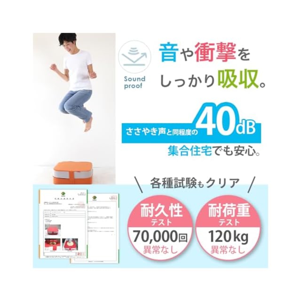 【衝撃と音を吸収し、負担を軽減】内側には衝撃と騒音を吸収する厚さ4cmの高密度ウレタンスポンジを採用。クッション性が高いので、更に弾力性が上がるだけでなく、衝撃と音を吸収、腰や膝への負担も軽減します。【滑り止めつき】底全面は滑り止め加工がされているので、飛び跳ねてもずれる心配がないので、フローリングでも安心してお使い頂けます。【踏み外さない安心サイズ】ケラッタの【FUN!FUN!JUMPER】は50cmx50cmのちょうどいいサイズ。足を踏み外す心配が無いので安心してジャンプを楽しめます。大きすぎないので、インテリアにも自然となじみます。