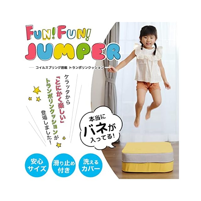 ケラッタのトランポリンクッション【FUN!FUN!JUMPER】は、おうち時間を楽しく過ごす魔法のクッション。やみつきになる跳ね心地で笑顔がはずむ!!ストレスがたまりやすいおうち時間も、本格的なジャンプでリフレッシュ!活動的なお子様も大満足なジャンプ力を実現しました。跳んだりステップしたり天気や時間に縛られず、おうち時間をぐっと楽しく彩ります。