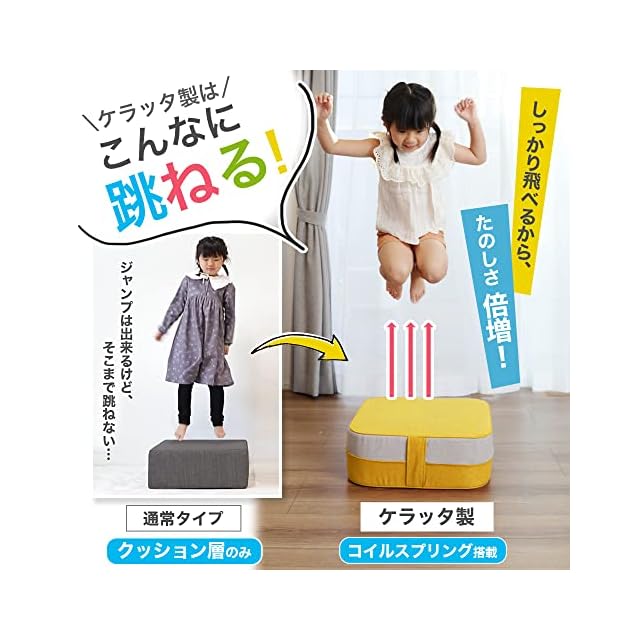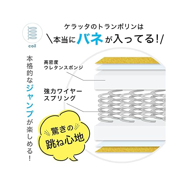 【跳ね心地の秘密は…】本当にバネが入ってる! 通常のクッションタイプのトランポリンは、ウレタンスポンジなどのスポンジ層のみで構成されていますが、ケラッタのトランポリンクッション【FUN!FUN!JUMPER】はコイルスプリング(バネ)を搭載!やみつきになる跳ね心地にとことんこだわりました。耐久性にも優れているので、へたりにくく、長い間お使いいただけます。【しっかり飛べるから楽しさ倍増!】 コイルスプリング(バネ)が入っていると跳ね心地も段違い!まるで本当のトランポリンみたいな跳ね心地に楽しさ倍増!