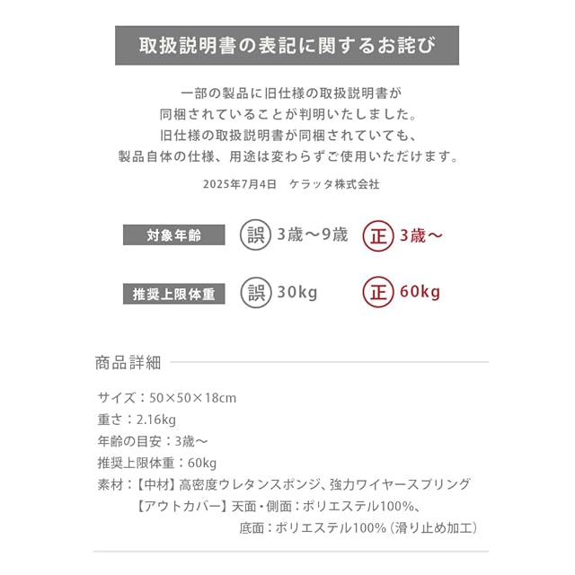 サイズ:50×50×18cm 重さ:2.16kg 推奨上限体重:60kg 素材:中材:高密度ウレタンスポンジ、強力ワイヤースプリング アウトカバー:天面・側面/ ポリエステル100% 底面/ ポリエステル100%(滑り止め加工)