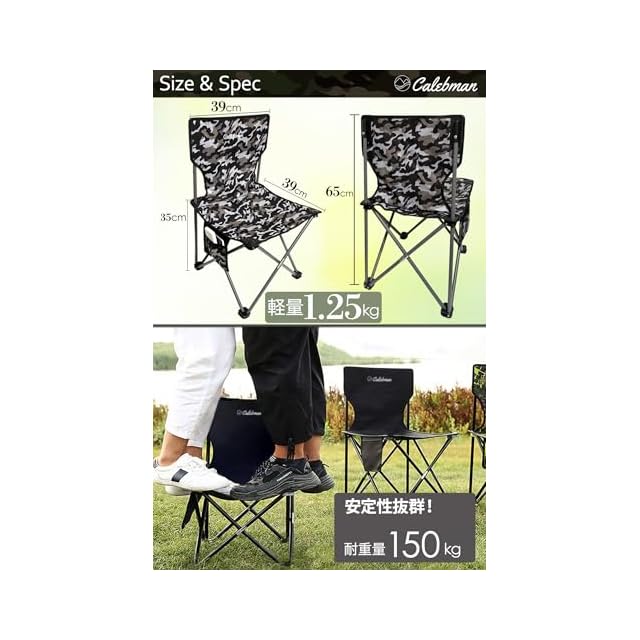 【商品仕様】○カラー:白黒迷彩、ベージュ、無地ブラック ○サイズ:縦39cm×横39cm×高さ65cm ○重量:1.25kg ○耐重量150kg ○素材:スチール、600Dオックスフォード生地 ○セット内容:背もたれ付アウトドアチェア、収納袋 ○用途:キャンプ、釣り、登山、BBQ、海、遠足、公園、テーマパーク、ベランダ、ガーデニング、行列の待ち時間用など ○ブランド:Calebman <安心の100日付>