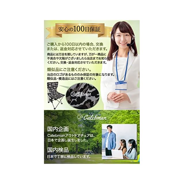 【日本の会社で企画】Calebmanアウトドアチェアは、日本で企画し誕生しました。アウトドアライフをもっと便利に、もっと楽しく過ごしていただける商品を企画しています。商品はご購入から100日間の付。なにかございましたら日本人スタッフが丁寧に対応いたします。