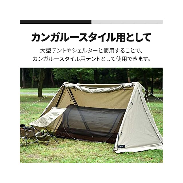 ✅【シェルターやタープ内のインナーとして】 カンガルースタイル用として シェルターやタープと使用することで、 カンガルースタイル用テントに。 ちょっとワイルドなキャンプも楽しめます。 ✅【簡単設営&軽量で持ち運びもラクラク】 いろんなシーンで使えるテント! テント泊で使用する以外にも、 車中泊や蚊帳のようにご自宅で、 ピクニックの時などにもGOOD!