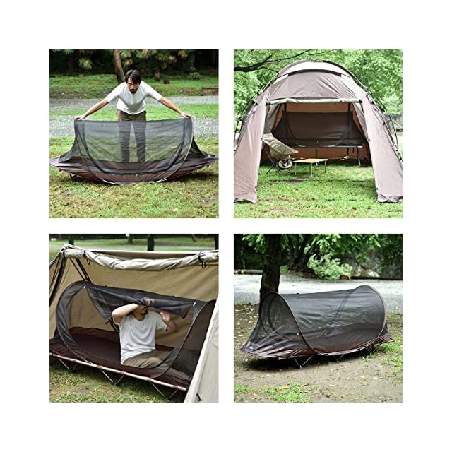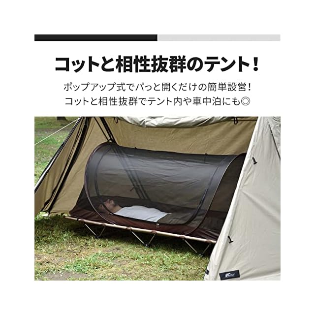 ✅【パッと開くだけのカンタン設営!】 コットと相性抜群のメッシュテント! パッと開くだけで組み立て簡単! 1人用のポップアップメッシュテントです。 テント内や車中泊など使い方いろいろ。 コットとの相性は抜群です!
