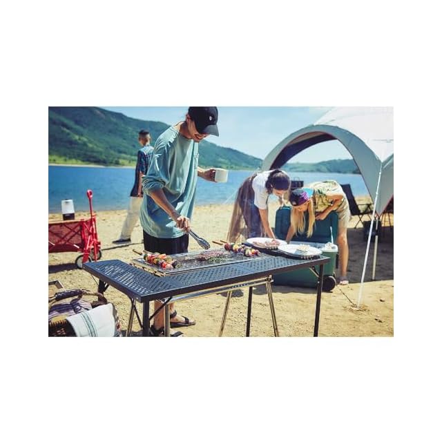 【使用シーン】バーベキューグリルと組み合わせて使えるテーブルです。大きなダイニングテーブルとしても使えるので、BBQやキャンプなど様々なシーンで活躍します。
