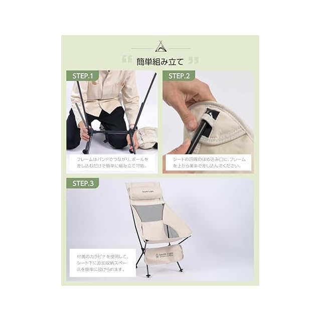 ⛺【キャンプ・レジャー / 小型組み立て式簡易チェア】キャンプやレジャーなど快適な小型の組み立て式チェアです。座面部分と骨組みの一人用タイプですが、耐荷重は120kg。体重をしっかり預けることができますので安心して身を任せることができます。全身を包み込んでリラックスできる座り心地です。座面高さ41cmは高すぎず、焚き火やローテーブルにぴったり。テント内でも隅に寄せて使えますので、テント内のスペースをより有効に使うことができます。