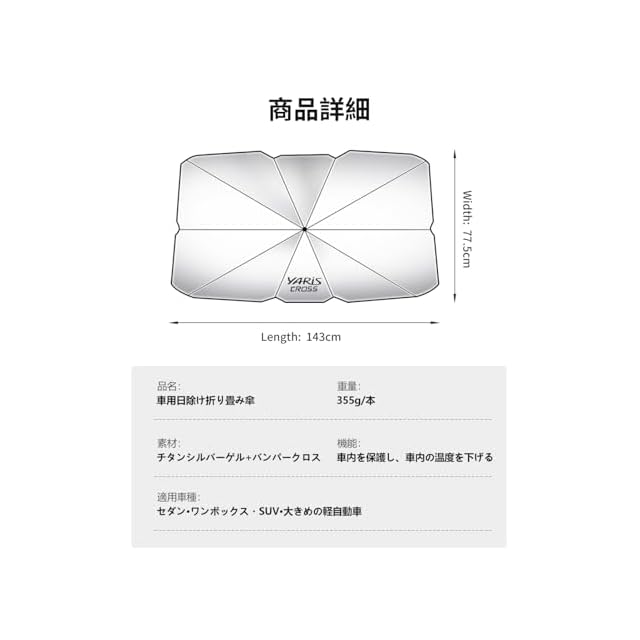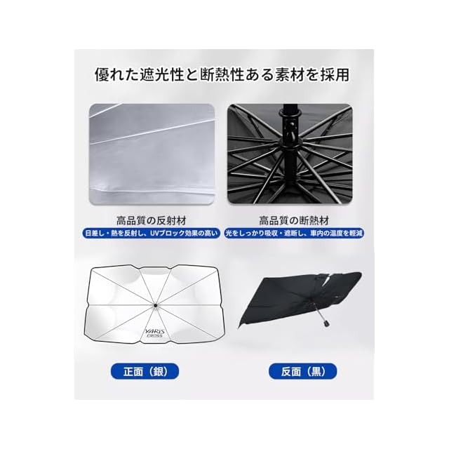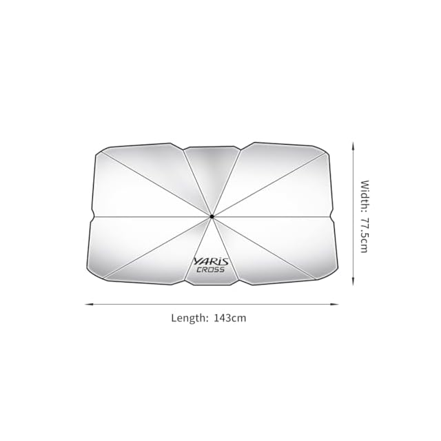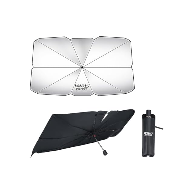【ロゴ付き・ご愛車に魅力を加える】この車用サンシェード傘は、銀面と付属の収納バッグに YARiS CROSS ロゴが付いております。遮光機能を持ちながら車を飾ることができ、駐車中のご愛車にアクセントを追加します。【適用車種】ヤリスクロス 10系 15系 X G Z GR アドベンチャー などのグレート対応します。ご注意:本製品のサイズは143×77.5cmです。ご購入前にご愛車のフロントガラスのサイズを測り、適合するかどうかをご確認ください。