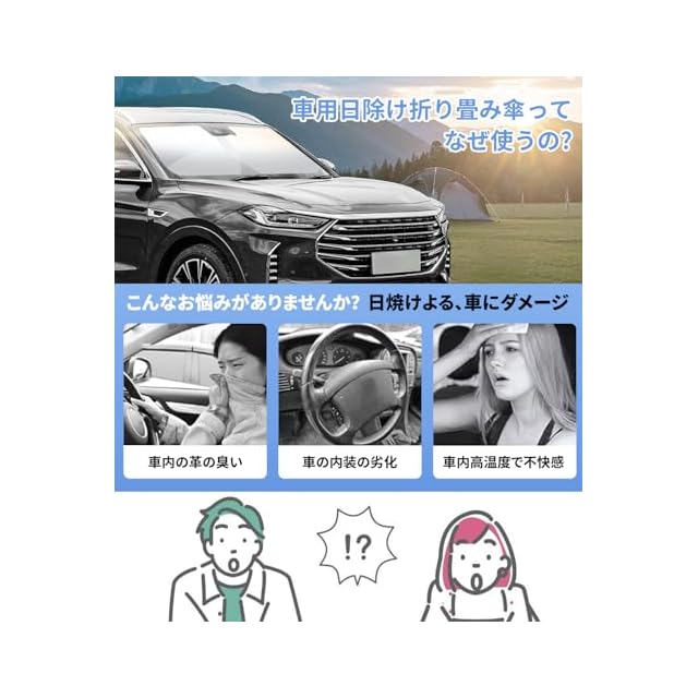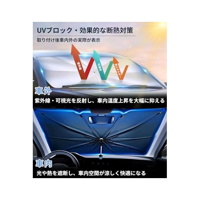 この車用サンシェード傘は、紫外線や熱を反射し、日焼けによる車内の劣化を防ぎ、夏場に屋外駐車して車に戻ると蒸し暑く感じるという悩みを解決します。