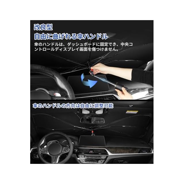 【改良した傘柄・ご愛車を守る】この車用日除け折り畳み傘のハンドルは改良され、曲げられるデザインを採用しております。傘のハンドルの方向を自由に調整でき、ダッシュバネルに固定し、中央制御ディスプレイを損傷することはありません。さらに、この車用サンシェード傘の先端には、傘の露先を覆う保護カバーも付いており、フロントガラスを傷つけなく、ご愛車により包括的なケアをもたらします。