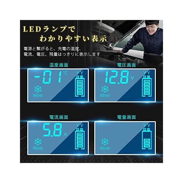 【LED表示、一目瞭然】LED画面で充電データは自動的に変わり、温度/電流/電圧/電気を表示できます。いつでもバッテリの充電状況がわかります。安心使用可能です。冬季と夏季モードがあります。充電器は内部温度を検出し、充電器は内部温度を検出でき、12℃以下に冬モードに入り、自動的に適切な電圧に切り替わり、十分に充電します。30℃以上に夏モードに入り、過充電しません