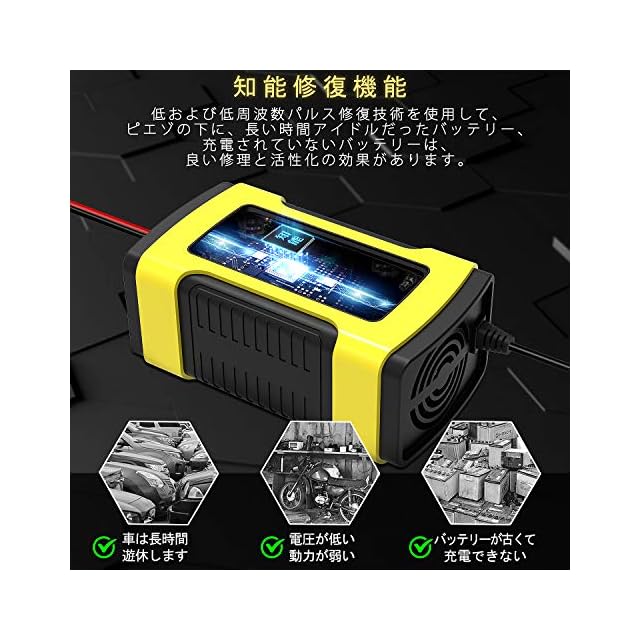 【優れたデザイン】静音の冷却ファンとアルミニウムラジエーターの組み合わせにより、バッテリー寿命を大幅に延長します。修復モードが搭載で、バッテリーの故障、充電の失敗、大きな内部抵抗などの問題を解決するために設計した修理モード、バッテリー充電器は耐用年数が長いでき、長くバイクに乗り続ける人なら大活躍です