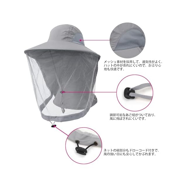【虫よけ・日よけ】蚊、ハエ、ハチなどの害虫からお肌を守る防虫ネット付き帽子です。虫除けネットが不要な時は、ツバの上に上げたりすることが可能です。つばが広くて紫外線を全方位しっかりカットしてくれるハットです。首の後ろもしっかりカード!!調節可能なあご紐、ネットの裾部分もドローコード付きで、風の強い日にも安心してかぶれます。