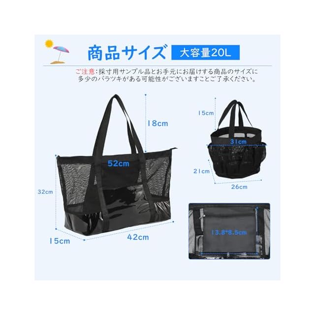<p><strong>商品基本仕様:</strong><br/>①バッグサイズ:42*32*15cm<br/>②マッチサイズ:40*15cm<br/>③容量:20L<br/>④材質:メッシュ+PVC<br/>⑤内ポケット1つ付き<br/><br/><strong>付属の小さめメッシュバッグ仕様:</strong><br/>①サイズ:18*31*21cm<br/>②マッチサイズ:26*21cm<br/>③材質:全体メッシュ<br/>④閉めるファスナーやボタンなどの留め具なし<br/>⑤フロントポケット7つ付き<br/><br/><strong>商品使用上にご注意:</strong><br/>①PVCに含まれる避けられない可塑剤臭いがあるため、ニオイをとることには風通しが良い日陰で3日間干す必要があります。<br/>②バッグを使用した後は、中の汚れや水分を拭き取り完全に乾かしてください。<br/><br/><strong>購入前にご注意:</strong><br/>●当商品は海外中国から輸入しております。<br/>●長距離輸送を経て国内へ輸入されている為、箱に傷やへこみ、汚れなどがある場合がございますが、使用上には本体に全く問題はございません。<br/>●正確なサイズと重量を測るよう心掛けておりますが、採寸用サンプル品とお手元にお届けする商品のサイズや重量に多少のバラツキがある可能性がございます。<br/>●商品写真はできる限り実物の色に近づけるように調整しておりますが、お使いのパソコン画面によって実際のものとは違う色合いに見える事がございますのでご了承下さい。</p>