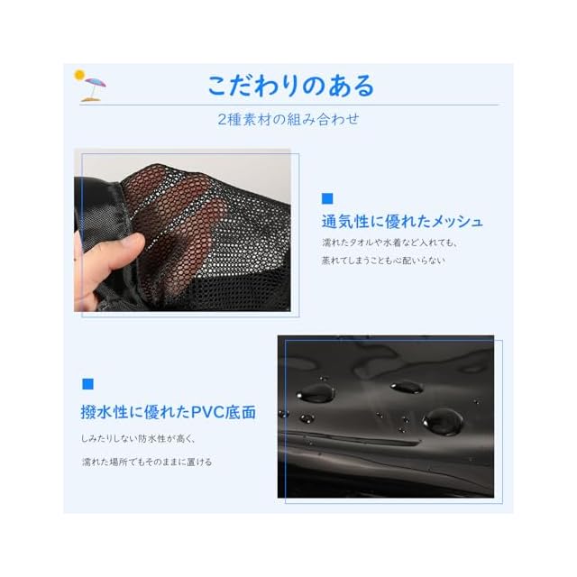 「通気性に優れたメッシュ上半部」バッグ上半分では中身を透けて確認できるメッシュ仕様となります。蒸れやすい濡れたタオルや水着など入れても、通気性抜群なメッシュより、蒸れてしまうことも心配いらなくなります。更にもう一つの小さめのメッシュバッグが付属してあり、外から収納物を見られたくないときはバッグインバッグのスタイルにすることにもご活用いただけます。