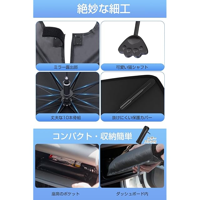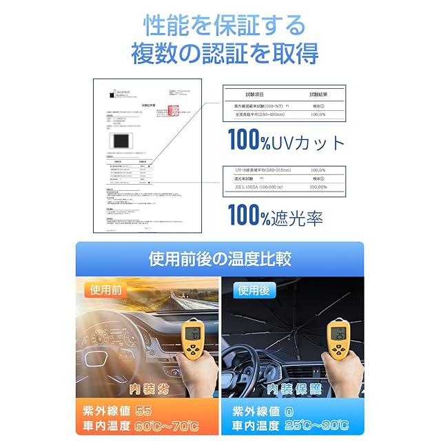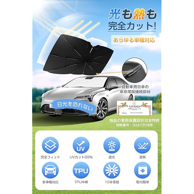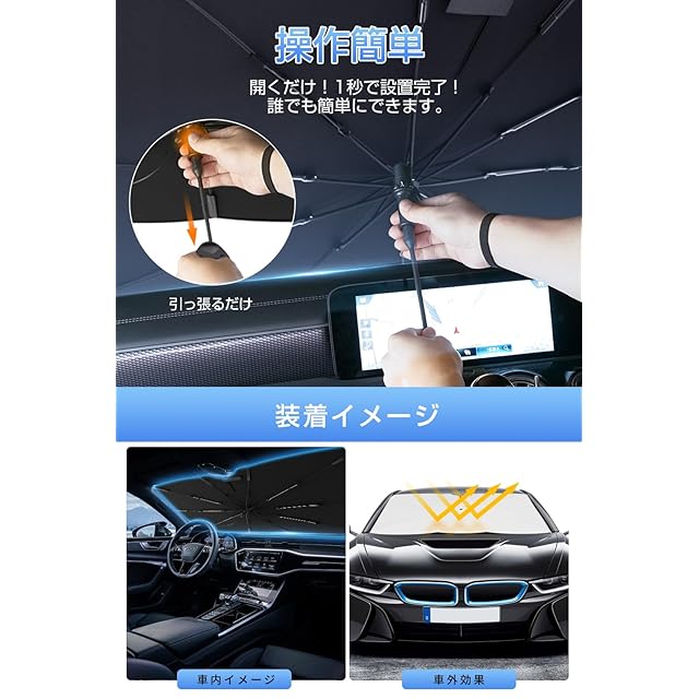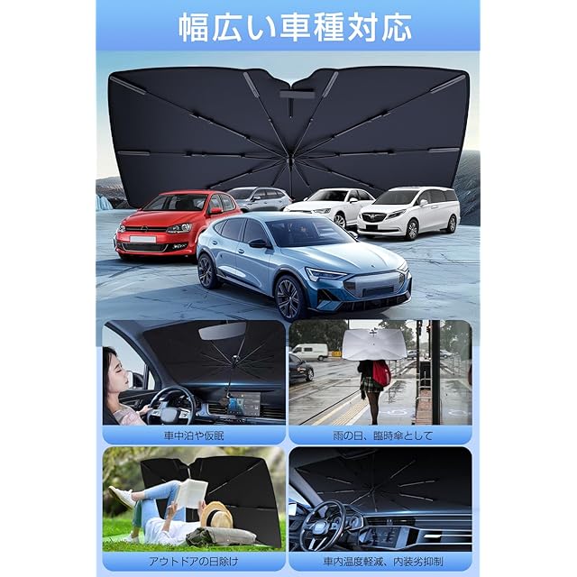 【様々な車に対応可能&幅広い用途】サイズを考える事が要らないで、ワンサイズで99%の車のフロントガラスに対応できます。軽自動車、ビジネス車、SUV、MPVなどの中大型車もコンパクトカー、スポーツカーなどの小型車も使用できます。普段駐車時の日除け用だけでなく、車中泊や仮眠時にプライバシーの保護に役に立てます。雨の日に傘を忘れた時本製品も仮の傘として使用でき、炎天下でも仮の日傘として使われます。商品の使用中に万が一不具合のようでしたら、弊店にお気軽にご連絡ください。また、何かご不明がございましたら、お気軽にお問合せ頂ければ幸いです。