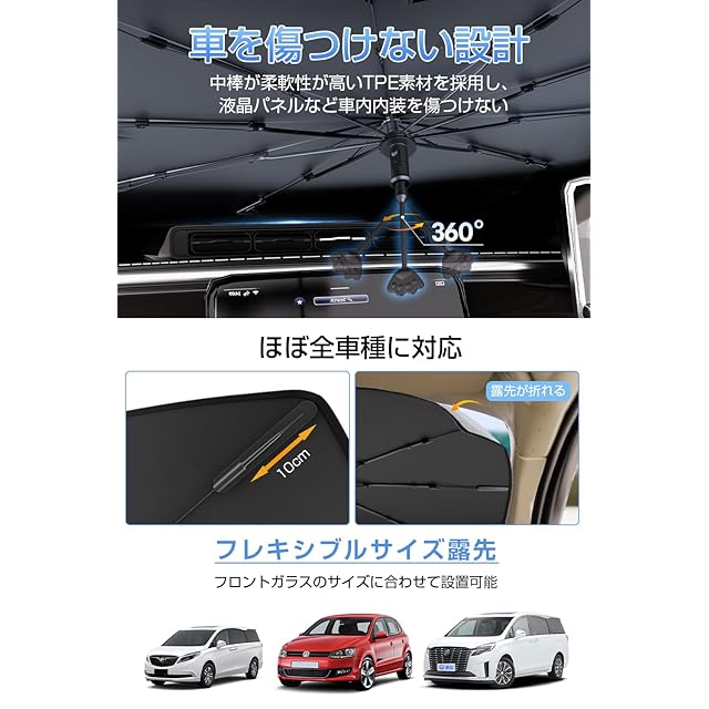 商品名:【新設計 完全フィット】 車用サンシェード フロント 360°折れる中棒 12層ナノ断熱素材 傘型 折りたたみ式 サンシェード 車用 遮光 遮熱 UVカット 紫外線遮蔽 取付簡単 バックミラー開き口 棒なし TPU中棒設計 内装を傷つけない 強化10本骨 日焼け対策 車中泊 仮眠 暑さ対策 収納ポーチ付き 10cm露先が折れる可能 ワンサイズでほぼ全車種に適用
